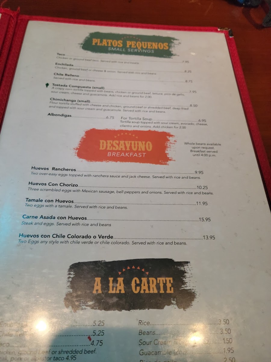The menu is a vibrant tapestry of options that caters to every palate. Start your meal with a selection from the A La Carte section, featuring must-try sides like creamy Guacamole and tangy Sour Cream. You can’t miss the Enchiladas Especiales either; choose from Enchiladas Verdes, Enchiladas En Mole, and even the enticing Enchiladas De Camaron for seafood lovers. Each enchilada is lovingly prepared, rich with flavor, and paired perfectly with a side of chips and salsa, offered complimentary. The Fajitas, a crowd favorite, deliver a sizzling display that tantalizes both the eyes and taste buds.